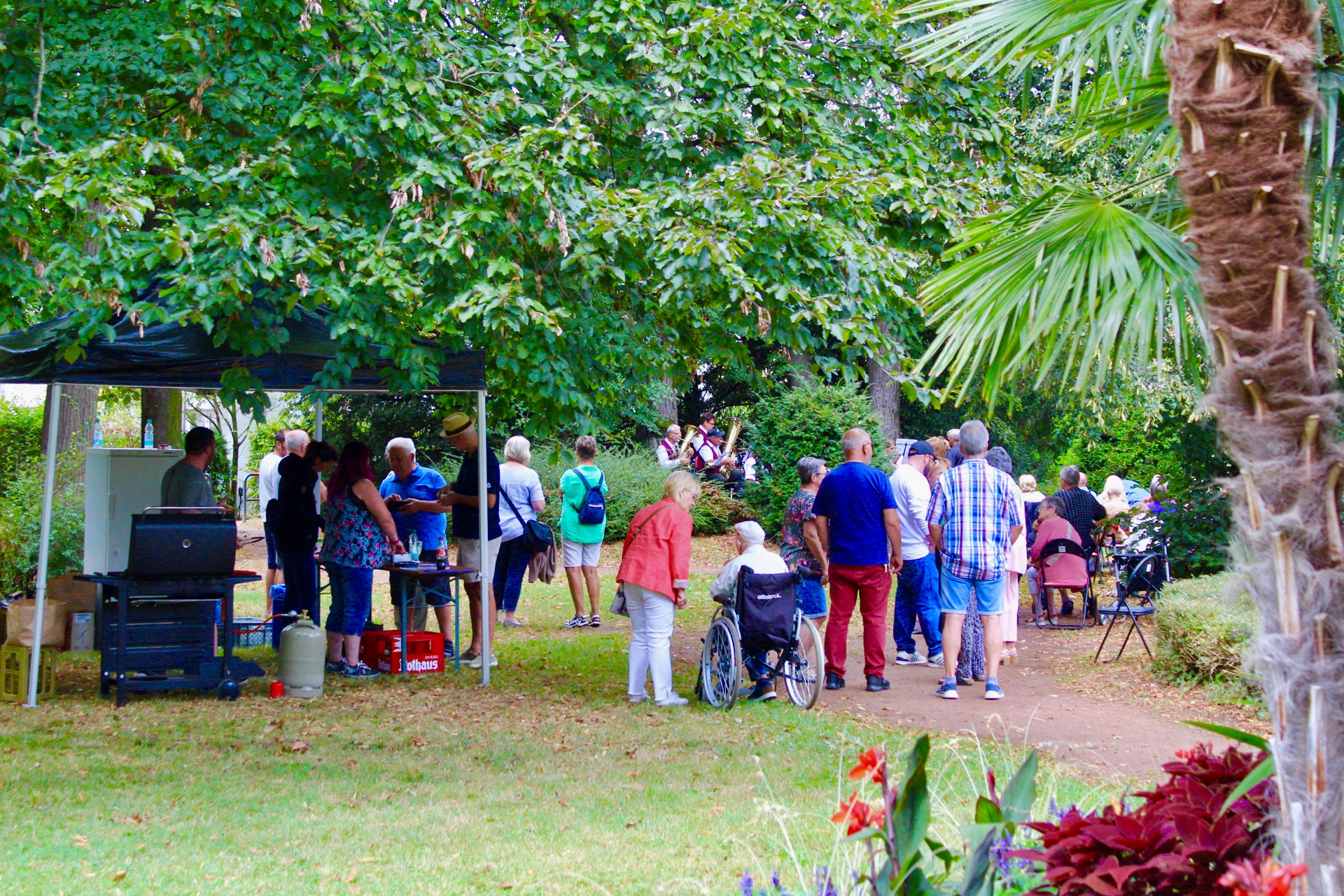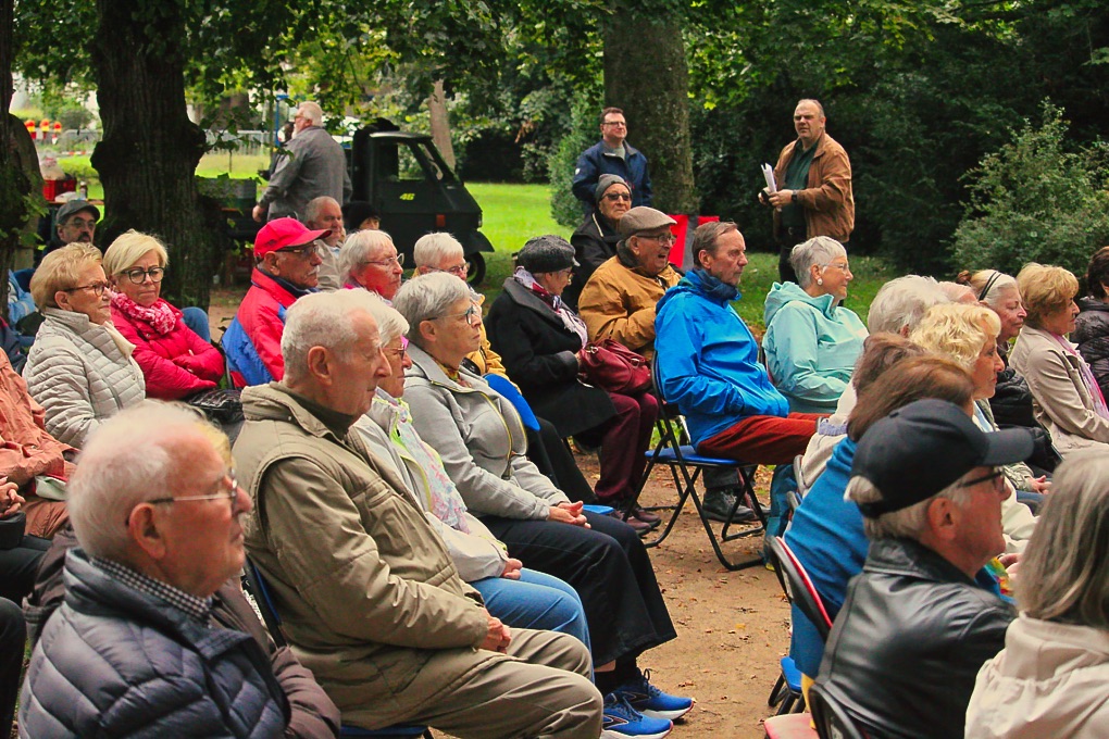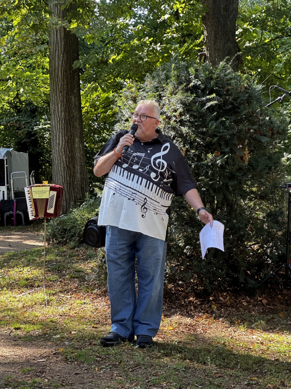 Mit einem famosen Auftritt startete am 26. Mai 2024 der Kulturring die Sonntagsmatineen im Läublinpark in die vierte Saison. Sonntag –Mittagszeit – bestes Wetter – ein schöner Park mit hohen Bäumen: das war die Grundvoraussetzung für eine gelungene Matinee. Die weiteren Akzente setzte der Seniorenspielring des Harmonika-Clubs Haltingen. Bezeichnenderweise mit dem Marsch „Frohes Wiedersehen“ begannen die Musikerinnen und Musiker unter ihrem Dirigenten Hans Zimmermann vor rund 100 Zuhörern ihr Programm. Ein wahres Kaleidoskop an Gute-Laune-Musik wurde geboten. Marsch, Tango, Cha-Cha-Cha, Polka oder Walzerklänge erfreuten das Publikum. Gekonnt humorvoll führte René Winzer durchs Programm. Nicht nur für Speis und Trank war gesorgt, ebenso sorgten etwa 70 Klappstühle dafür, dass sich die Gäste wohlfühlten. Da der Umstand, dass die Bühne in diesem Jahr ihr 100. Jubiläum begeht gewürdigt werden soll, wird es an jeder Matinee eine Fortsetzungsgeschichte über die Historie des Läublinhofs geben. (Monika Merstetter)